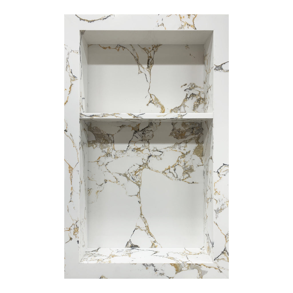 Upgrade your shower with the 15x24 Calacatta Gold Engineered Stone Shower Niche. This durable, waterproof niche features two spacious shelves for easy organization and boasts an elegant Calacatta Gold finish that suits both classic and modern bathrooms.