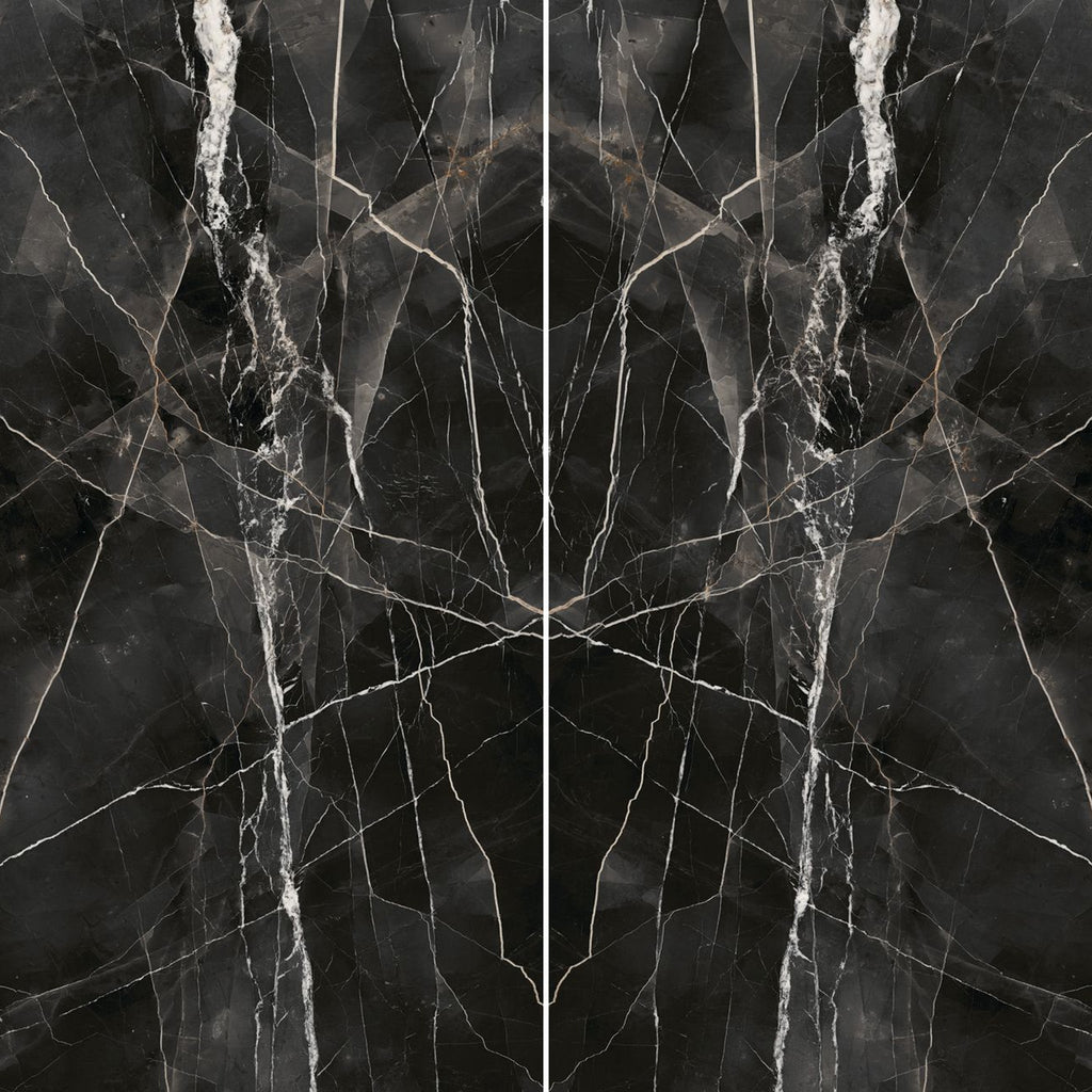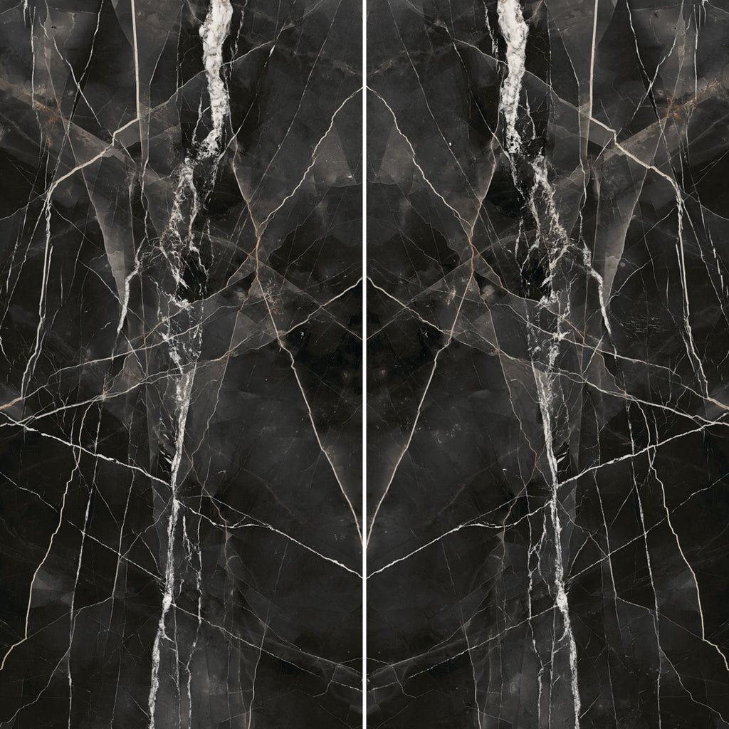 Calacatta Noir commands attention with its deep black backdrop, intersected by bold white and silver veining that crisscross like natural lightning strikes. Its striking contrast and refined marble-inspired pattern make it an exceptional choice for luxurious, contemporary spaces seeking drama and sophistication.
