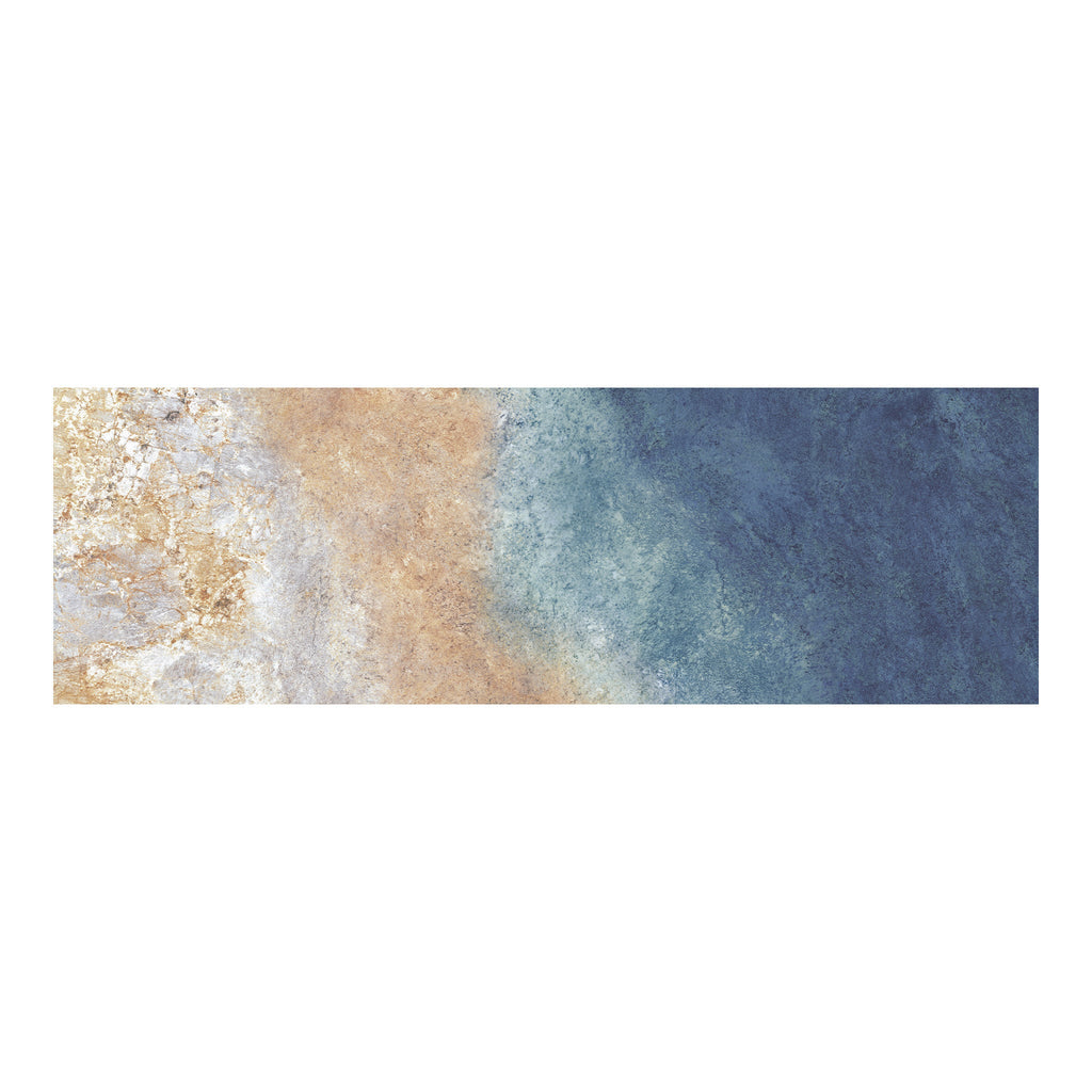 Rock Board Sky features a captivating gradient that mimics the natural transition from sandy earth to ocean depths. Beginning with light, marble-like veining and warm beige tones at the base, the design gradually shifts through soft tans and muted golds before blending into cool turquoise and deep navy hues. This seamless blend of color and texture evokes the serenity of a shoreline, combining the rugged beauty of natural stone with the calming essence of water. Ideal for creating tranquil, nature-inspired spaces, "Rock Board Sky" offers both elegance and visual movement.
