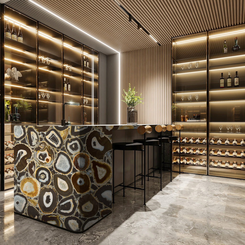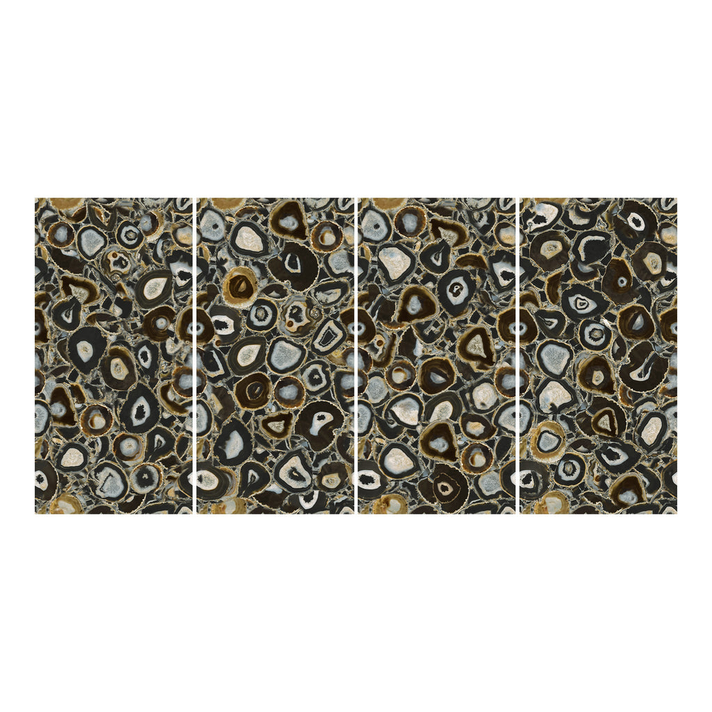 Agate Opal is a striking celebration of natural luxury, featuring a mosaic of sliced agate stones in deep blacks, warm ambers, and cool greys. Each segment showcases intricate banding and crystal-like textures, highlighted by golden veins that bring a rich, opulent character to the design. The high contrast and polished appearance give Agate Opal a dramatic, gemstone-inspired aesthetic—perfect for statement walls, countertops, or upscale decor seeking bold sophistication and organic beauty.