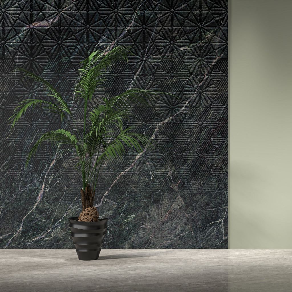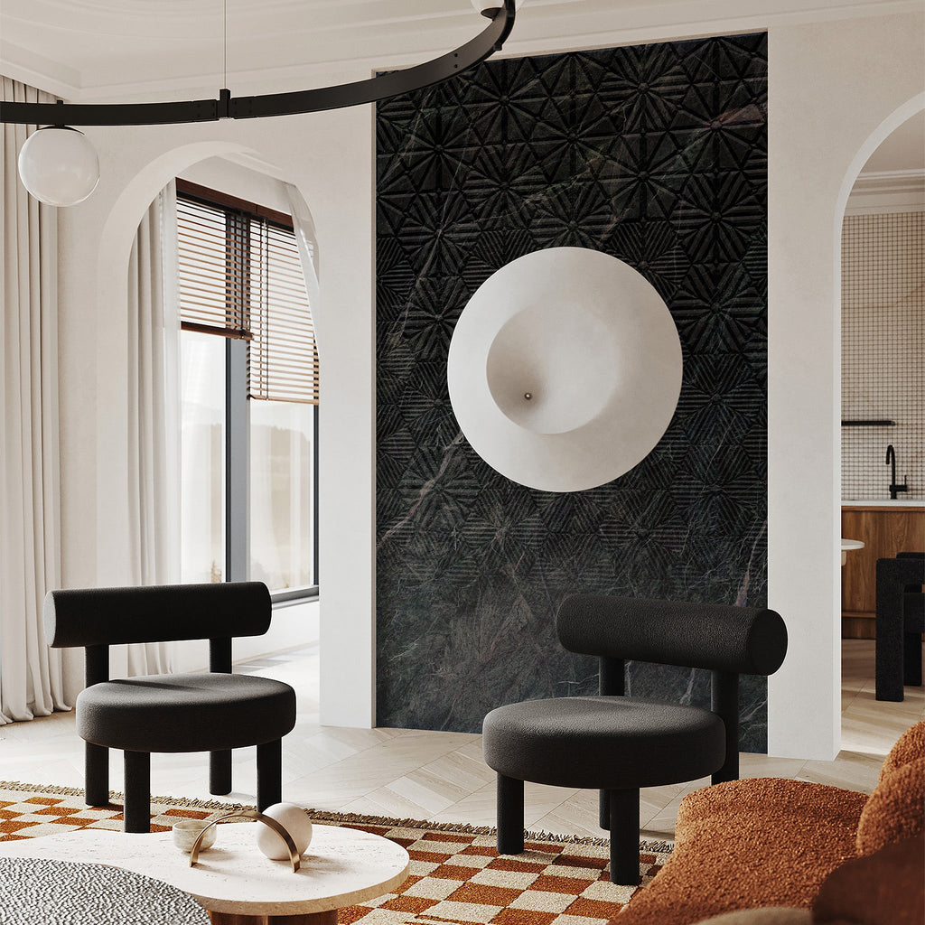 Composer Black blends bold sophistication with artistic detail, featuring a deep black marble base enriched by striking natural veining and a geometric textured overlay. The interplay of stone and subtle patterns creates depth, dimension, and modern elegance. Perfect for feature walls or statement surfaces, Composer Black transforms interiors into luxurious works of art.